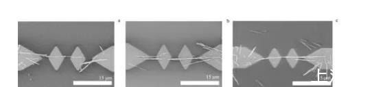 為了探究納米線的介電組裝特性,首先在寬度約為4μm的單島微電極上進行ZnO納米線的組裝實驗,不同頻率下的實驗結果見圖2.圖2a顯示,電場頻率為150 kHz時,有少量納米線將導電島和電極搭接起來;圖2b顯示,電場頻率為500 kHz時,搭接導電島和電極的納米線數量增多,且左右兩側的電極上也沉積了少量的納米線;圖2c顯示,電場頻率為1 MHz時,搭接導電島和電極的納米線數量再次增多,并且出現了互相平行的納米線。