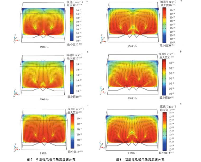 圖7單島微電極電熱流流速分布 圖8雙島微電極電熱流流速分布