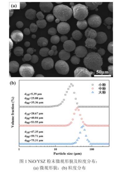 本研究在燒結制備的電解質表面采用APS制備氫電極和氧電極后組裝了Ni/YSZ|ScSZ|LSCF電解池。其中ScSZ(10 mol%氧化鈧穩定的氧化鋯,青島天堯實業有限公司)電解質冷壓成形后經1400℃燒結5 h制備,厚度與直徑分別為1 mm與Φ10 mm。將電解質雙面刮涂一薄層ScSZ后經燒結獲得約5 mm后的粗糙層以匹配APS電極層。采用NiO/YSZ(青島天堯實業有限公司)復合粉末作為氫電極材料,粉末的形貌及尺寸信息如圖1所示,其中NiO和YSZ的比例為6:4。將粉末分篩為標稱5~30μm、30~50μm與50~75μm的三種不同粒度進行試驗,分別稱為小粉、中粉、大粉。陰極采用Oerlikon-Metco公司生產的平均粒徑為25 mm的LSCF粉末噴涂制備。在電解質表面APS制備的電極尺寸為Φ8 mm,APS工藝參數如表1。