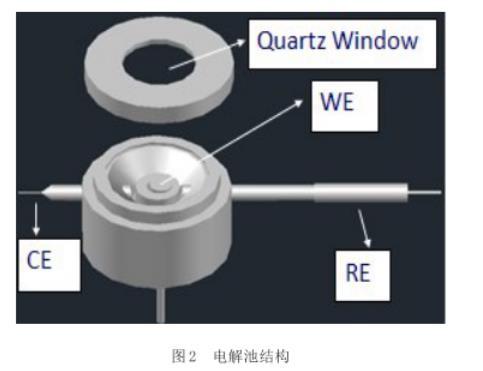 在本實(shí)驗(yàn)中,我們使用三電極體系電解池,其構(gòu)造如圖2所示,整個(gè)電解池除電極的金屬部分全部是由耐高溫的聚四氟乙烯制成,具有不易腐蝕、性質(zhì)穩(wěn)定、和抗老化等優(yōu)良特性。系統(tǒng)下端為工作電極,左邊為對(duì)電極,右邊為參比電極以及石英窗組成。在實(shí)驗(yàn)過程中,石英窗既可以防止電解液外漏,又不會(huì)對(duì)激光造成干擾。在本次實(shí)驗(yàn)中,參比電極為銀/氯化銀電極,鉑絲作為對(duì)比電極。我們選擇銀制工作電極作為載體,在銀電極的表面均勻旋涂適量的金納米片,自然干燥后金納米片和銀表面緊密結(jié)合且可以導(dǎo)電,就得到了金納米片微電極。