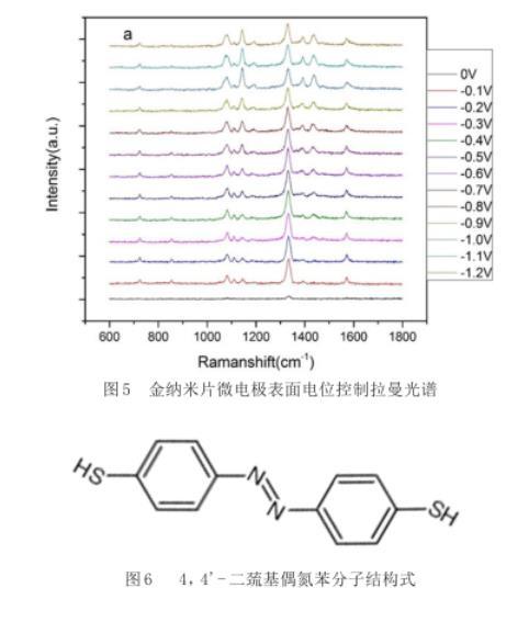 我們將濃度為0.01mol的4NTA分子溶液滴加在金納米片微電極表面,待干燥后進(jìn)行變電位的拉曼光譜測量,電解液為Na2SO4溶液。在顯微共焦拉曼光譜儀(Renishaw InVia)的視野內(nèi)選擇一片較大的金納米片,光斑集中在納米片的中央位置,然后均勻改變電極電位,同時(shí)測量不同電位下的拉曼光譜,如圖5。在本試驗(yàn)的圖4(a)中我們發(fā)現(xiàn)模擬光譜和固體4NTA光譜中在714cm-1附近有一個(gè)非常微弱的峰,它表示S-CH3的振動(dòng),但是在隨電位連續(xù)變化的拉曼光譜中并未發(fā)現(xiàn),這是由于4NTA分子在加電壓前就已經(jīng)在液態(tài)環(huán)境中完成了脫甲基的過程,通過S-吸附在基底上。在0V一直降到-0.2V過程中,并沒有新的峰出現(xiàn),說明此電位下并未發(fā)生化學(xué)反應(yīng),直到電位降到-0.3V時(shí),才在1437cm-1處出現(xiàn)微弱的拉曼峰,而后隨著電壓的持續(xù)下降,這個(gè)峰也逐漸明顯。此處1437cm-1處的拉曼峰可歸屬于-N=N-雙鍵的伸縮振動(dòng)模式。與此同時(shí)我們發(fā)現(xiàn),在1338cm-1的峰也有明顯的減小,由此可知,在-0.3V時(shí)已經(jīng)有少量4NTA分子的硝基開始脫氧,脫氧后的基團(tuán)又倆倆合并成DMAB分子,如圖6。直到-1.2V時(shí)1338cm-1處的峰都沒有消失,說明樣品分子還沒有反應(yīng)完全,可能與我們所用的激光波長和功率有關(guān)。
