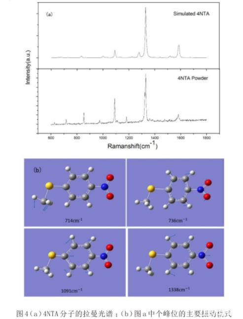 圖4(a)4NTA分子的拉曼光譜;(b)圖a中個(gè)峰位的主要振動(dòng)模式