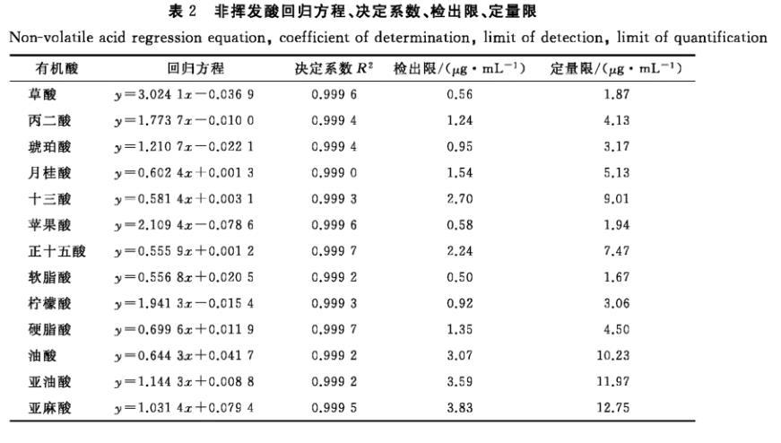 2.1.1標準曲線、檢出限和定量限由表2可知,13種非揮發酸的回歸方程線性良好,決定系數R2>0.999,檢出限為0.50~3.83μg/mL,定量限為1.67~12.75μg/mL。