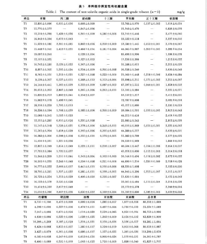 2.1.3樣品的測定卷煙非揮發性有機酸含量的測定結果見表4,單料煙非揮發性有機酸含量的測定結果見表5。