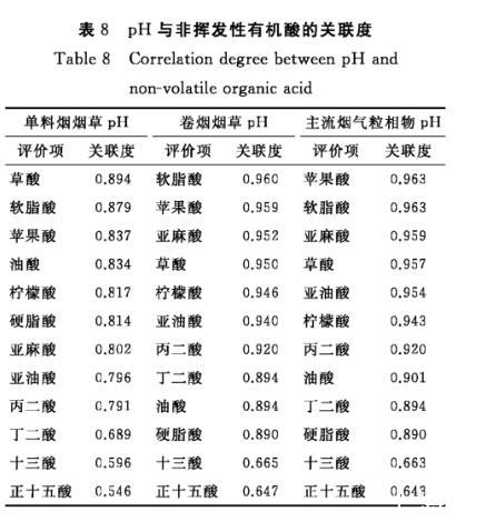 為考察各非揮發性有機酸對pH的影響程度,根據表4~表7中測定結果,分別以單料煙煙草pH、卷煙煙草pH、主流煙氣粒相物pH為母序列,以相應的非揮發性有機酸作為特征序列,分辨系數ρ取0.5,數據經均值化處理后進行灰色關聯度分析,結果見表8。