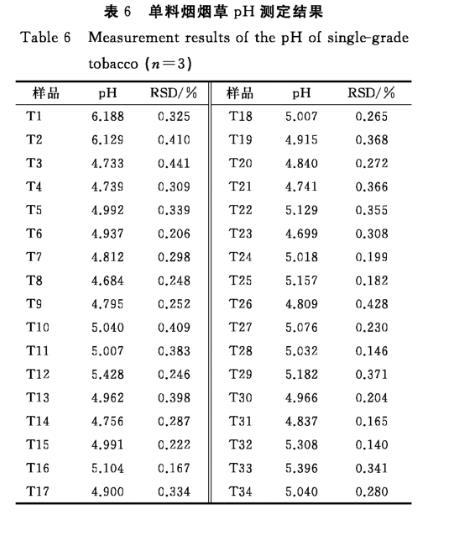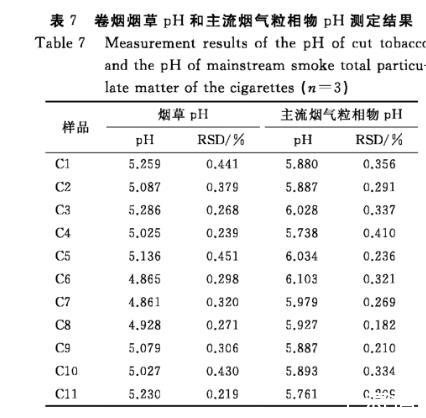 表7卷煙煙草pH和主流煙氣粒相物pH測定結果