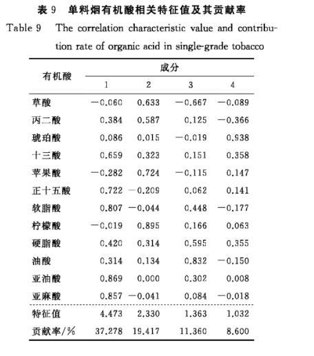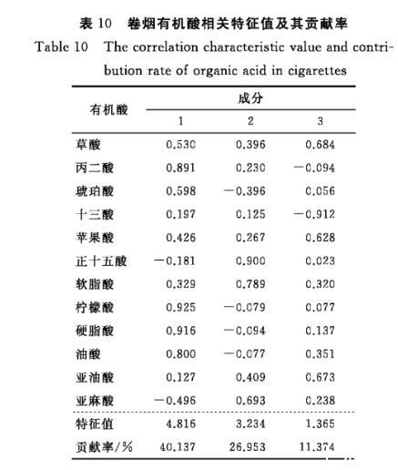 由表10可知,卷煙有機酸共提取出3個主成分,其方差貢獻率分別為40.137%,26.953%,11.374%,累計方差貢獻率為78.46%;卷煙有機酸第1主成分包括檸檬酸、硬脂酸、丙二酸等,第2主成分包括正十五酸、軟脂酸、亞麻酸等,第3主成分僅包括草酸、亞油酸、蘋果酸等。結合灰色關聯度分析結果可知,第2、3主成分中的軟脂酸、蘋果酸對卷煙煙草pH、主流煙氣粒相物pH的影響程度較大。