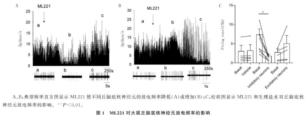 腹腔注射烏拉坦1 g/kg麻醉大鼠,將大鼠放置在立體定向框架中,水平固定頭部,切牙桿位于雙耳線下方3.3 mm處。定位丘腦底核(前囟后3.1~4.2 mm,旁開2.0~3.0 mm,顱骨外表面下7.2~9.0 mm)并進行開顱手術(shù)。三管玻璃微電極的記錄電極管內(nèi)注入含有20 g/L滂胺天藍的0.5 mol/L乙酸鈉溶液,其余兩管則分別注入無菌生理鹽水和10μmol/L的ML221。使用液壓推進器將玻璃微電極尖端推至丘腦底核,記錄到神經(jīng)元放電并穩(wěn)定5 min后,通過生物細胞納升精密注射器將生理鹽水或ML221注射到記錄的細胞表面。放大器和數(shù)模轉(zhuǎn)換器將生物信號轉(zhuǎn)化為數(shù)字信號后傳輸至計算機,用Spike 2軟件進行記錄和分析。