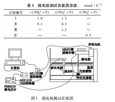 2)測試系統(tǒng)。試驗采用自制NH4+,NO3——,NO2——和pH等4種離子選擇性微電極,對污泥基團內(nèi)部中氮素遷移轉(zhuǎn)化特征進行研究,制作方法參照國外相關(guān)制作方法。制作的微電極尖端直徑在25μm以內(nèi),響應(yīng)時間≤2s,穩(wěn)定性較好,符合實際檢測應(yīng)用所需標(biāo)準(zhǔn)。微電極測試線路如圖1所示。表1微電極測試各基質(zhì)濃度圖1微電極測試系統(tǒng)圖從反應(yīng)器進水端取出顆粒污泥置于測量室中,先用昆蟲針沿豎直方向插入顆粒污泥兩端,使其固定在致密的網(wǎng)狀支撐物上,預(yù)培養(yǎng)3h后進行測定。利用微調(diào)控器調(diào)節(jié),使得電極尖端處于顆粒表層以上300μm處開始測定,步長設(shè)為100μm.由于顆粒內(nèi)部物質(zhì)濃度呈對稱性分布特征,微電極測定時只檢測了顆粒污泥一半?yún)^(qū)域氮素的空間分布特征,以得到具有代表性的濃度分布變化。