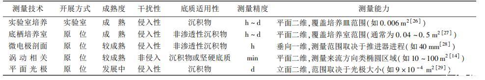 除水環境渦動相關技術外,目前測量沉積物水界面通量的方法還有實驗室培養技術(laboratory core incubation)、底棲培養室技術(benthic chamber)、微電極剖面技術(micro-profiling)和平面光極技術(planar optode)等,主要技術特性對比見表1。總的來說,渦動相關技術因其將觀測點布置于沉積物水界面上方而具備非侵入式觀測的顯著優點,又具有測量范圍廣和時間精度高等特點,能夠對傳統方法難以適用的高滲透性砂質底泥和生長水棲植物的堅硬底質進行長期觀測。但是,該技術對數據處理方法提出了較高的要求,且可測量的通量類型受到傳感器性能發展的限制。