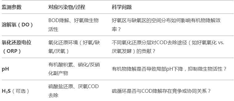 缺氧/厭氧貢獻(xiàn):深層(>30 cm)ORP<-100 mV時(shí),可能存在發(fā)酵或甲烷化途徑(COD降解但BOD檢測(cè)不到)。