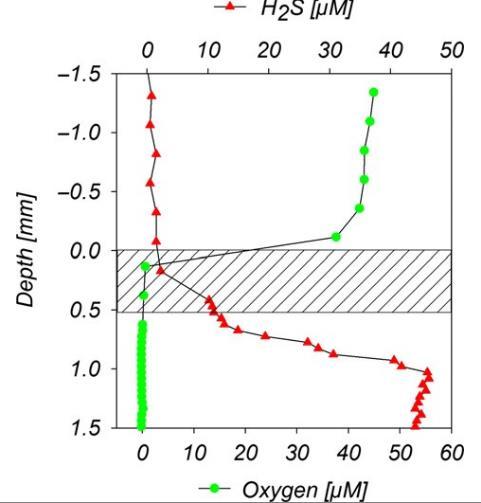 圖5、在WhMat2微生物群落中垂直懸崖上測量的H2S和氧微傳感器剖面,泉水流經過并行。陰影區域表示生物膜的位置。