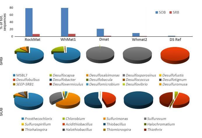 圖3、顯示研究微生物群落中硫酸鹽還原細菌(SRB)和硫氧化細菌(SOB)序列頻率的圖表,以及死海(DS Ref)沉積物(上部)。下部顯示每個樣本中檢測到的屬的相對序列頻率。