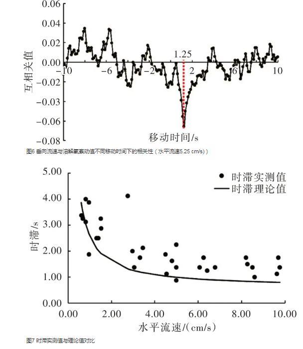 由于氧通量結果對時滯取值較為敏感,而理論時滯與實際情況存在一定偏差,因此實際應用較少采用理論值。本文參照Lorrai等的方法確定實際時滯大小,首先參照相關研究中時滯大小,確定時滯的取值為10 s,接著將溶解氧紊動值相對于垂向流速紊動值的時間序列進行移動,并計算兩者的相關性,時滯即為最大相關性所對應的移動時間。利用Matlab軟件中的xcorr函數進行時滯校正。圖6為水平流速5.25 cm/s下垂向流速與溶解氧紊動值相關性隨移動時間的變化情況,可以看出,當移動時間為1.25 s時,溶解氧和垂向流速紊動值的相關性最大,因此該水平流速下的時滯為1.25 s。采用相同方法,將不同水平流速下時滯的實測值與理論值進行分析(圖7),可以看出,時滯隨水平流速的增大而減小且與理論值擬合情況良好。說明理論時滯雖與實際情況存在一定偏差,但在實際應用中可以根據流速條件得到理論時滯值后,為時滯取值范圍的確定提供參考。