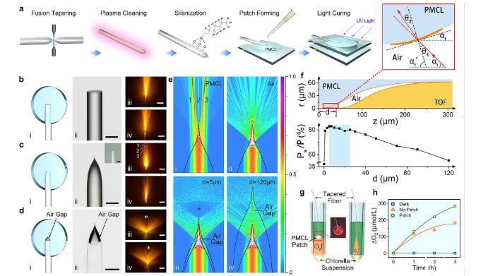 圖2、iCarP的制備和光散射性能。a TOF在PMCL貼片中的制備。產(chǎn)生了一個(gè)空氣間隙以獲得iCarP。b–d平面光纖光子器件(FEOF)(b)、嵌入PMCL貼片中的TOF(c)和iCarP(d)。(i)器件的示意圖,(ii)器件的顯微圖(代表性大于3個(gè)器件),比例尺=100微米,c的插圖:錐形光纖尖端,比例尺=2微米,(iii、iv)器件的正視圖(iii)和側(cè)視圖(iv)以及激發(fā)的熒光,比例尺=5毫米。*表示iCarP正向方向的暗區(qū)域。比例尺=5毫米。e光子器件發(fā)出的光的模擬電場(chǎng)強(qiáng)度分布,(i)PMCL中沒(méi)有空氣間隙的TOF,(ii)空氣中的TOF,(iii)具有d=5微米的iCarP,(iv)具有d=120微米的iCarP。f頂部:iCarP中空氣間隙和TOF尖端的軸對(duì)稱橫截面圖,底部:橫截面的百分比光功率(Ps)與總功率(P)之間的關(guān)系以及d的關(guān)系,插圖:局部光路圖,(z:TOF尖端到空氣間隙尖端的距離;αt:空氣/PMCL界面的切線平面與TOF軸向方向之間的角度;αt’:切線平面法線與TOF軸向方向之間的角度;αi:入射光的發(fā)散角;θ1:空氣側(cè)的入射角;θ2:PMCL側(cè)的折射角;P:空氣間隙的總光功率;Ps:正向傳播區(qū)域的光功率)。g iCarP照明誘導(dǎo)的嘧啶藻氧產(chǎn)生的檢測(cè)方案:iCarP(左)和TOF(右)處于“開(kāi)啟”狀態(tài),浸入嘧啶藻懸浮液(綠色),并監(jiān)測(cè)氧產(chǎn)生。h iCarP或TOF照明誘導(dǎo)的嘧啶藻氧累積產(chǎn)生,以及在黑暗中。
