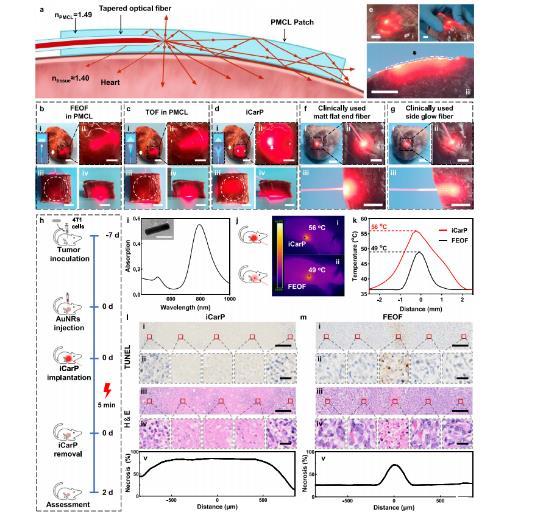 圖4、不同光纖/貼片光子器件的照明范圍和深度以及腫瘤光熱消融效果的比較。a iCarP光學(xué)路徑的橫截面示意圖。b–d被光子器件照明的離體豬心的全景圖(i)和放大圖像(ii):平面光纖(FEOF)在PMCL中(b),TOF在PMCL中(c),以及iCarP(d),插圖:光纖端結(jié)構(gòu)和相應(yīng)的光散射圖示,(i)比例尺=2.5厘米;(ii)比例尺=1厘米。白色箭頭表示光纖。頂視圖(iii)和正視圖(iv)的1.5厘米厚心臟組織,被相應(yīng)的光子器件照亮(器件完全被心臟組織覆蓋;它們的位置用白色圓圈標(biāo)出),比例尺=1厘米。e iCarP照明對離體豬心的影響,比例尺=1厘米。白色箭頭表示光纖,黑色箭頭表示空氣間隙的位置。(i)iCarP以較低功率照明的豬心,與(d)中的情況相比,顯示了散射光的分布。(ii)iCarP照明扭曲的豬心。(iii)iCarP和豬心肌的橫截面,與(a)中的配置相同。f、g臨床上使用的啞光平端光纖(f)和側(cè)發(fā)光光纖(g)的照明范圍和深度。離體豬心的全景圖(i)、放大圖像(ii)和橫截面(iii)。比例尺=1厘米。h動物研究的時間線。i金納米棒的光吸收譜,插圖:>100金納米棒的代表性透射電鏡圖像。比例尺=50微米。j iCarP(i)和FEOF(ii)照明的小鼠的紅外熱成像。k iCarP(i)和FEOF(ii)照明的小鼠的溫度。l、m iCarP(l)和FEOF(m)照明的治療效果(代表性的n=3個生物獨(dú)立樣本)。(i)照明腫瘤的代表性TUNEL染色圖像,比例尺=200微米。(ii)TUNEL染色圖像,比例尺=20微米。(iii)照明腫瘤的代表性H&E染色圖像,比例尺=200微米。(iv)放大的H&E染色圖像,比例尺=20微米。(v)基于H&E染色的壞死的定量分析。