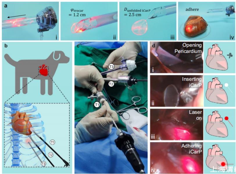 圖5、iCarP與微創(chuàng)植入兼容。a iCarP在經(jīng)過切口器的穿透:(i)折疊的iCarP(直徑2.5厘米)插入切口器(直徑1.2厘米),(ii)iCarP通過切口器的出口,(iii)iCarP通過切口器穿過并展開,(iv)展開的iCarP粘附在豬心表面。b在犬模型中進(jìn)行微創(chuàng)植入iCarP的示意圖。T1:用于抓取鑷子的切口器;T2:用于彎曲剪刀的切口器;T3:用于內(nèi)窺鏡的切口器。c在犬模型中進(jìn)行微創(chuàng)植入iCarP的胸腔鏡下植入。d iCarP植入的步驟示意圖:(i)開放心包;(ii)插入iCarP;(iii)打開照明;(iv)粘附iCarP。