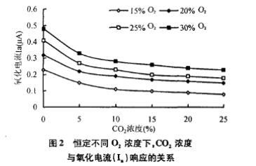 因此只要預先知道了0的濃度,依照這一0濃度下的I一V。對應關系,便可通過所采集的氧化電流信號(I。)得出CO2:的濃度。