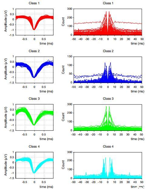 圖4、神經元分類為假定主細胞(PCs)與中間神經元(INTs)。左圖:基于主成分分析的四類神經元波形圖。右圖:對應的自相關直方圖(ACG)。