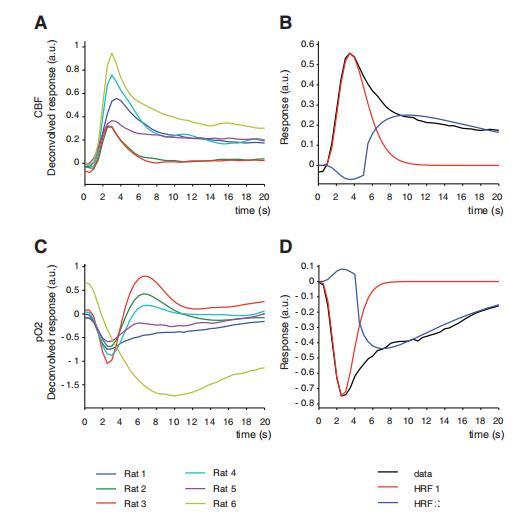 圖5、血流動力學與代謝響應函數(HRF)。A:通過反卷積計算獲得的各只大鼠CBF脈沖響應函數。B:基于大鼠1的CBF響應(黑色),擬合的gamma函數HRF1(紅色)和HRF2(藍色)。C:所有大鼠經反卷積獲得的PO2響應。D:大鼠1的PO2響應擬合gamma函數。需注意大鼠間存在顯著變異(體現在響應幅值及后半段形態差異:CBF表現為向基線的漂移,PO2則出現超調)。ED發生時刻定義為時間0。