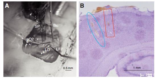 圖1、A:展示大鼠癲癇樣放電(EDs)模型活體同步記錄實驗設置的顱骨開窗照片。該模型通過體感皮層注射荷包牡丹堿(Bic)誘導,實驗裝置包括:用于多單元電活動(MUA)記錄的硅探針(SP)、記錄局部場電位(LFP)的鎢電極、監測腦血流量(CBF)的激光多普勒探頭(LD)以及檢測組織氧分壓(PO2)的氧探頭。B:尼氏染色腦切片顯示記錄區域,標注注射位點(藍色橢圓)及硅探針單側電極排的植入位置(紅色方框)。