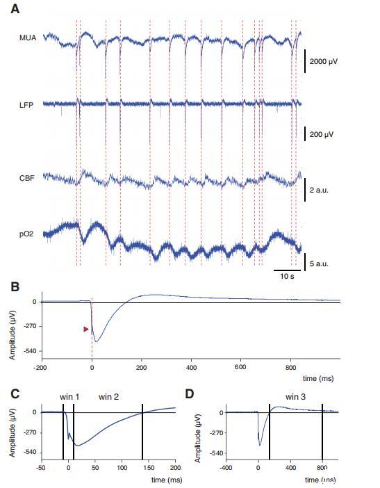 圖3、對癲癇樣放電(EDs)的多模態響應。A:同步多模態記錄數據,包括硅探針采集的多單元電活動(MUA)、場電極采集的局部場電位(LFP)、激光多普勒測量的腦血流量(CBF)以及氧探頭測量的組織氧分壓(PO2)。紅色虛線標記每次放電的起始時間點(time 0)。a.u.表示任意單位。B:A圖中單個ED的放大顯示。紅色箭頭指示用于設定time 0的極尖銳峰值。C:分別對應銳波上升支(win1)和下降支(win2)的時間窗放大圖。D:對應EDs慢波成分(win3)的時間窗放大圖。