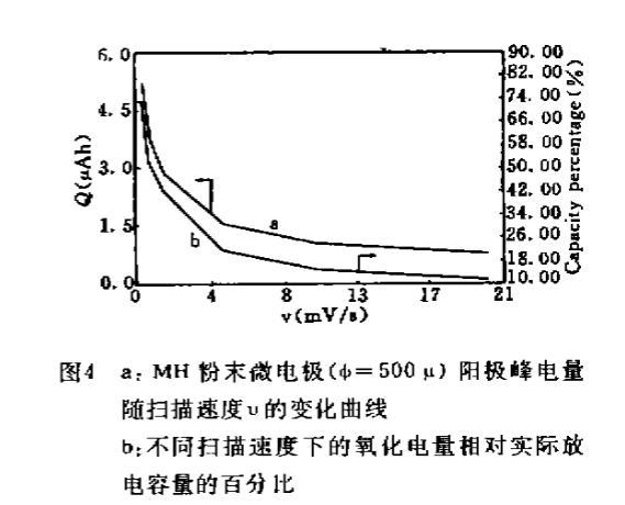 圖4 a:MH粉末微電極(φ=500μ)陽極峰電量隨掃描速度υ的變化曲線b:不同掃描速度下的氧化電量相對實際放電容量的百分比