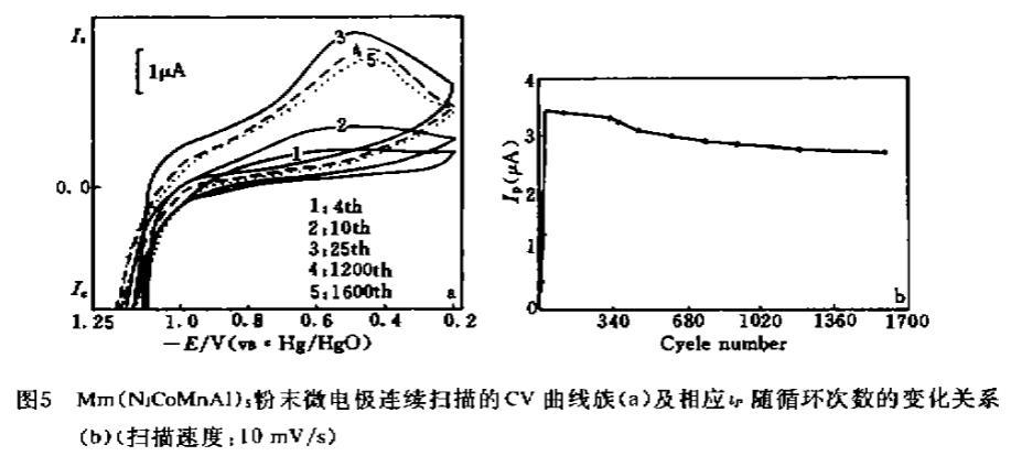 如上所述,在較快掃描速度(>10 mV/s)下,循環伏安法測量的充放電容量和效率較低,換言之由于固相擴散限制,合金材料的本體未能充分利用,吸放氫過程主要發生在表面區域。一般說來,電極活性材料的循環壽命主要取決于表面狀態在充放電過程中的變化。因此,利用循環伏安法獲得的放電容量隨掃描次數的衰減情況來判斷合金材料的循環性能又是充分可靠的。圖5a是Ml(NiCoMnAl)5粉末微電極的循環伏安曲線。在連續掃描過程中,表征MH放電容量的陽極峰面積在快速增加后,隨著掃描次數的增加又逐漸減小,反映了合金的活化和性能
