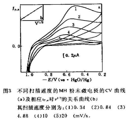 圖3不同掃描速度的MH粉末微電極的CV曲線(a)及相應i P,a對ν1/2的關系曲線(b)其掃描速度分別為:(1)0.34(2)0.84(3)4.88(4)10(5)20(mV/s)