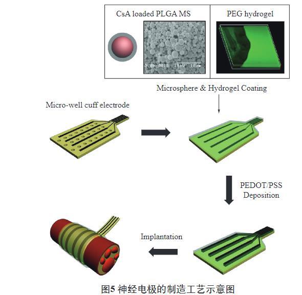 細(xì)胞實(shí)驗(yàn)結(jié)果表明,細(xì)胞在整個(gè)裝置上都能出現(xiàn)黏附和分化,證明了其良好的生物相容性。Heo等研制了一種聚乙二醇水凝膠包覆的神經(jīng)電極,其中水凝膠含有聚乳酸-羥基乙酸(Poly(lactic-co-glycolic)acid,PLGA)微球,微球中含有環(huán)孢素A(Cyclosporin A,CsA)(如圖5)。