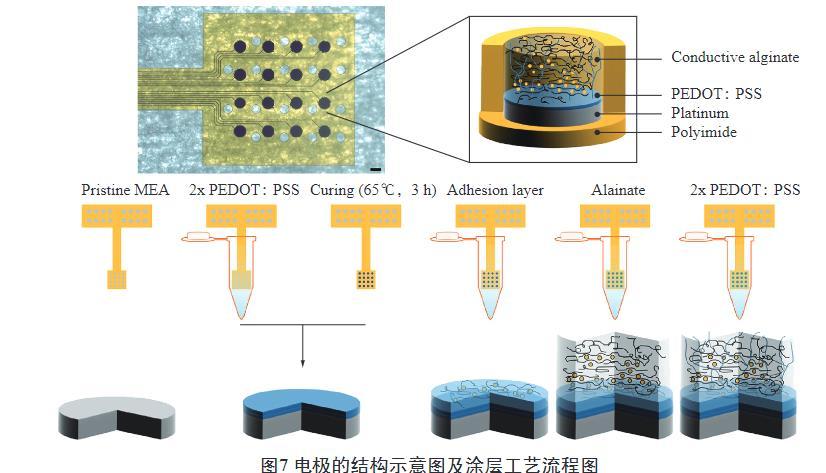 當(dāng)神經(jīng)微電極植入生物組織時(shí),會(huì)破壞血管導(dǎo)致神經(jīng)細(xì)胞損傷,破壞血腦屏障,使宿主血清蛋白吸附在電極表面,激活小膠質(zhì)細(xì)胞引發(fā)組織炎癥,導(dǎo)致植入電極周圍形成膠質(zhì)瘢痕。水凝膠具有優(yōu)良的生物相容性,可減少電極周邊蛋白質(zhì)吸附,進(jìn)而減少神經(jīng)元細(xì)胞損傷和電極周圍的膠質(zhì)瘢痕。Kleber等使用合成水凝膠和聚(3,4-乙烯二氧噻吩)制備了復(fù)合導(dǎo)電聚合物水凝膠系統(tǒng)(如圖3)。