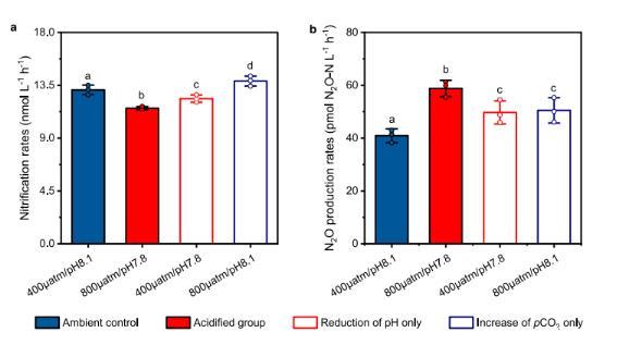研究結果表明,由于人為活動引起的富營養化和大氣CO2濃度升高的協同效應,正在進行的水體酸化可能會破壞氮循環的關鍵環節,并增加強效溫室氣體N2O的排放,特別是在河口和沿海水域。與我們的預期相反,在酸化條件下,升高的pCO2并未對化能自養硝化細菌展現“CO2施肥”效應。硝化細菌在轉錄水平上對酸化的響應顯著,并顯著上調了與細胞內pH穩態相關的基因表達,以應對酸化壓力。這些結果為揭示酸化影響硝化作用和相關N2O排放的機制提供了重要的見解,進一步的酸化可能通過刺激N2O排放改變河口和沿海水域的氮循環,并加速全球變暖。