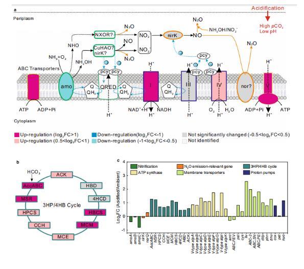 圖5、氨氧化古菌(AOA)對酸化的響應。a.描述酸化對參與NH?氧化、N?O產生、能量生成和AOA的細胞內pH穩態基因表達的影響的示意模型。相對基因表達的變化(FC)通過將酸化樣本與環境對照組進行比較計算。羅馬數字表示呼吸鏈中的酶復合物I(NADH脫氫酶)、復合物III(b-pcy)、復合物IV(pcy-aa3)和復合物V(ATP合成酶)。虛線藍色箭頭表示電子的移動。b.酸化對參與3-羥基丙酸/4-羥基丁酸循環基因表達的影響。蛋白質圖標中心的顏色表示基因轉錄本編碼這些蛋白的上調或下調程度。蛋白質圖標外圍的顏色與(c)中的條形圖顏色相對應。c.如(a)和(b)所示的蛋白質編碼轉錄本的FC變化。