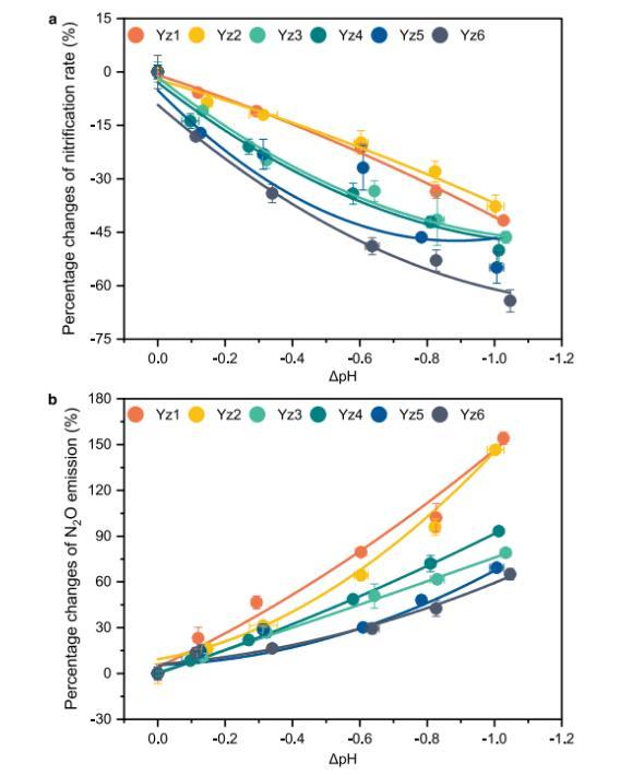 圖2、模擬水體酸化對長江口及其鄰近沿海區域硝化作用和相關N?O產生速率的響應。硝化速率。數據展示了酸化處理組與環境對照組相比硝化速率的百分比變化。所有線條的P值均小于0.05。b.N?O產生速率。數據展示了酸化處理組與環境對照組相比N?O產生速率的百分比變化。所有線條的P值均小于0.05。誤差條表示標準差(n=3個生物學獨立樣本)。ΔpH對應水體酸化前后pH值的變化。擬合曲線是通過多項式擬合方法獲得的。
