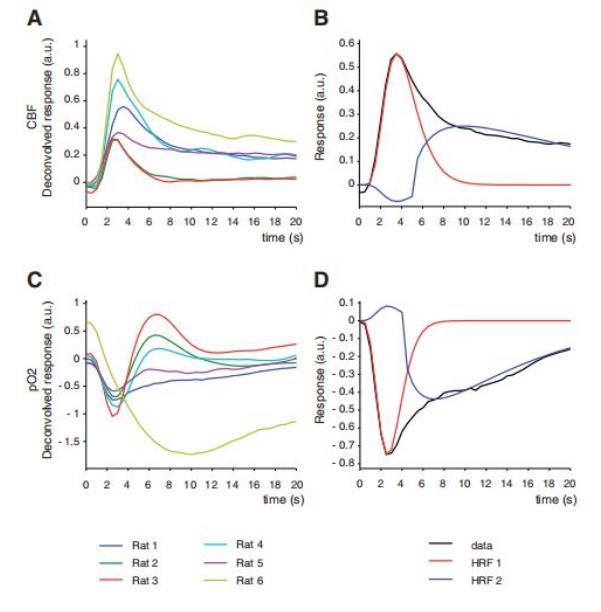 圖5、血流動力學與代謝響應函數(HRF)。A:通過反卷積計算獲得的各只大鼠CBF脈沖響應函數。B:基于大鼠1的CBF響應(黑色),擬合的gamma函數HRF1(紅色)和HRF2(藍色)。C:所有大鼠經反卷積獲得的PO2響應。D:大鼠1的PO2響應擬合gamma函數。需注意大鼠間存在顯著變異(體現在響應幅值及后半段形態差異:CBF表現為向基線的漂移,PO2則出現超調)。ED發生時刻定義為時間0。