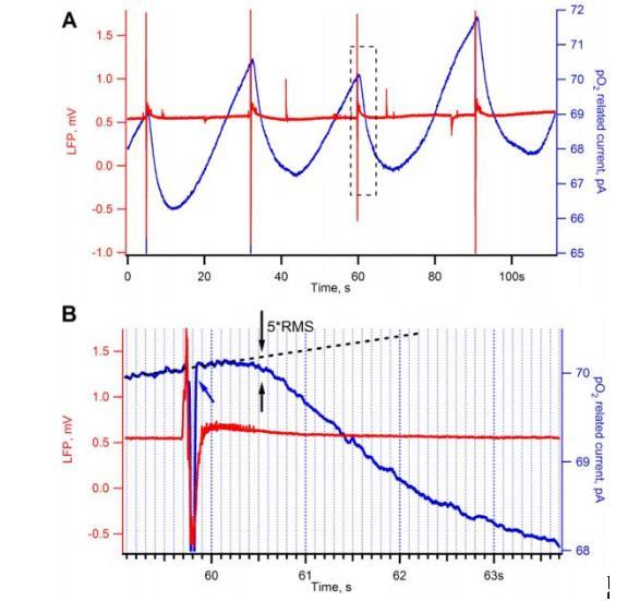 圖2、氧分壓(PO2)探頭延遲時間的評估。采用離體完整海馬組織,通過荷包牡丹堿誘導癲癇樣放電(EDs)。A:7日齡小鼠海馬組織在10μM荷包牡丹堿誘導EDs(紅色曲線)期間的氧相關電流信號(藍色曲線)。B:為評估每次ED與氧消耗起始之間的時間延遲,從氧信號中減去基線斜率(黑色虛線)。消耗起始點定義為:經基線校正后的氧相關電流振幅達到基線噪聲均方根(RMS)振幅5倍時的時刻(黑色箭頭)。