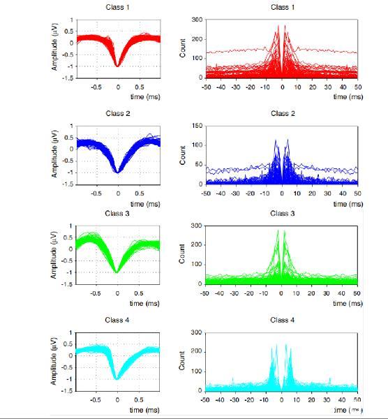 圖4、神經元分類為假定主細胞(PCs)與中間神經元(INTs)。左圖:基于主成分分析的四類神經元波形圖。右圖:對應的自相關直方圖(ACG)。