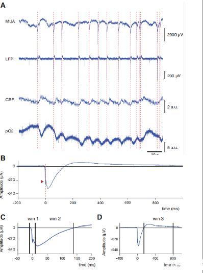 圖3、對癲癇樣放電(EDs)的多模態響應。A:同步多模態記錄數據,包括硅探針采集的多單元電活動(MUA)、場電極采集的局部場電位(LFP)、激光多普勒測量的腦血流量(CBF)以及氧探頭測量的組織氧分壓(PO2)。紅色虛線標記每次放電的起始時間點(time 0)。a.u.表示任意單位。B:A圖中單個ED的放大顯示。紅色箭頭指示用于設定time 0的極尖銳峰值。C:分別對應銳波上升支(win1)和下降支(win2)的時間窗放大圖。D:對應EDs慢波成分(win3)的時間窗放大圖。
