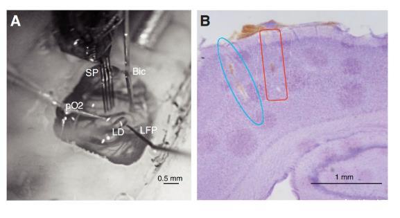 圖1、A:展示大鼠癲癇樣放電(EDs)模型活體同步記錄實驗設置的顱骨開窗照片。該模型通過體感皮層注射荷包牡丹堿(Bic)誘導,實驗裝置包括:用于多單元電活動(MUA)記錄的硅探針(SP)、記錄局部場電位(LFP)的鎢電極、監測腦血流量(CBF)的激光多普勒探頭(LD)以及檢測組織氧分壓(PO2)的氧探頭。B:尼氏染色腦切片顯示記錄區域,標注注射位點(藍色橢圓)及硅探針單側電極排的植入位置(紅色方框)。