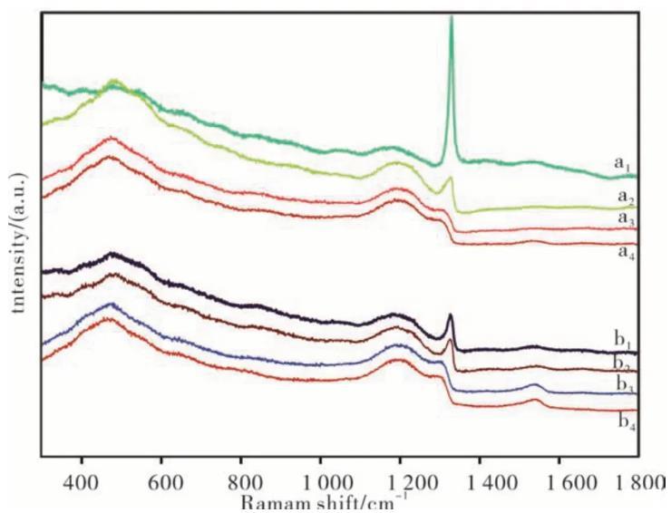 圖3為不同沉積參數(shù)下BDD薄膜的Raman光譜圖,其中a1—a4為溫度700℃、摻雜量分別為0.2、0.4、0.8和1.2 mL·min-1,b1—b4為溫度800℃,摻雜量分別為0.2、0.4、0.8和1.2 mL·min-1。