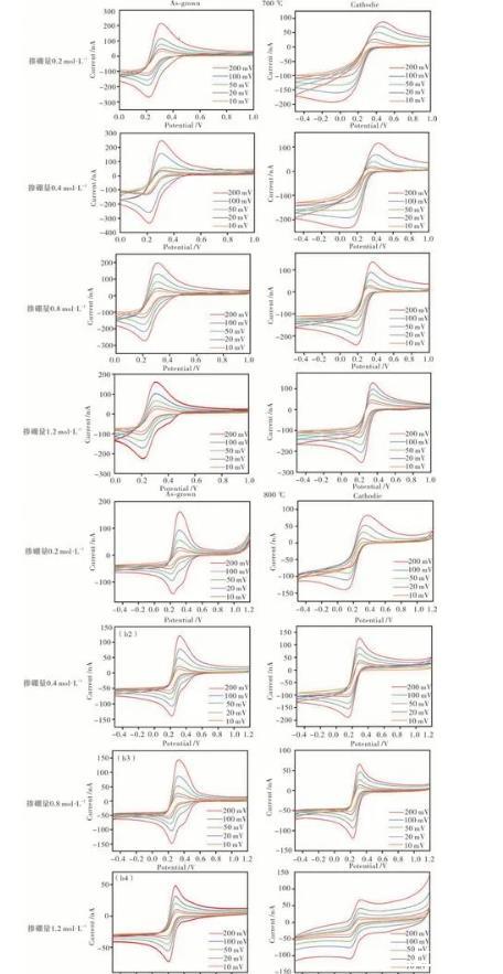 圖4為在CH4為1%(體積分?jǐn)?shù))、700和800℃下沉積的不同摻硼濃度的BDD微電極在KCl(0.1 mol·L-1)+K3[Fe(CN)6](1 mmol·L-1)溶液中的CV圖。其中,As-grown為原生狀態(tài)的BDD微電極測(cè)得的CV圖,而Cathodic狀態(tài)是As-grown對(duì)應(yīng)的微電極經(jīng)過(guò)線性伏安掃描(0—3V、100 mV·s-1)10次陽(yáng)極極化后(anodic狀態(tài)),再經(jīng)過(guò)-4 V陰極極化600 s后的CV圖。