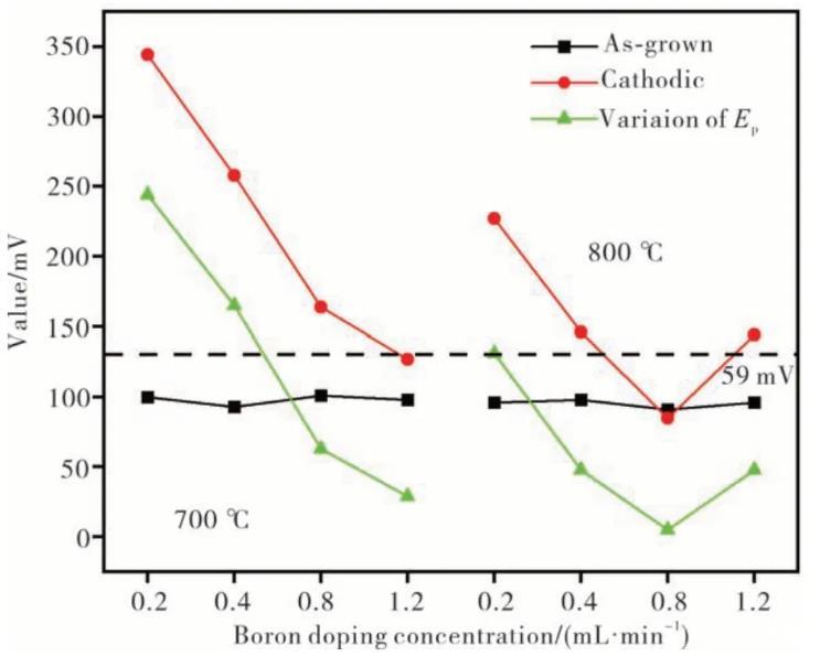 利用同一個樣品在As-grown和Cathodic狀態下ΔEp的變化量(Variation)來衡量電極從氧端基恢復到氫端基的難易程度,即Variation值越大,越難恢復。圖6為不同溫度沉積的電極的ΔEp值及不同狀態下ΔEp的變化量曲線圖。從圖6可見,對于As-grown狀態的電極,不同溫度下其ΔEp的值幾乎不變,而陰極極化后不同溫度沉積樣品的Variation均隨摻硼量的增加而變小,這說明隨著摻硼量的增加氧終端恢復為氫終端的難度降低。由于[Fe(CN)6]3-/4-體系對金剛石表面的氫、氧終端非常敏感,而表面氫、氧終端的變化最終反映在ΔEp的變化上。As-grown狀態的電極在富氫氣環境下獲得,其表面充滿氫端基而表現出一致的電化學性能,經過電化學陽極氧化處理后BDD電極表面部分C—H基團逐步轉化為C—O基團,其中(100)面主要是形成羰基(C O)和乙醚基(C—O—C),而在(111)面則主要形成的是羥基(C—OH),這些碳氧基團阻止了電化學反應在電極表面的反應,降低了電化學反應的速率,使得ΔEp增加、峰電流減小。有研究表明,在0.1 mol·L-1的H2SO4溶液中、在2.4 V下經60 min的電化學陽極極化,在金剛石表面會形成羰基(C O)、羥基(-OH)等含氧基團,表面的O/C比達到了12%,而原生的As-grown狀態的金剛石表面的O/C比則小于1%;經過陰極極化處理后,金剛石表面部分氧端基轉變為氫端基,提高了電化學反應活性,使得電位差變小;摻硼量越大,Variation越小,金剛石電極越容易通過陰極極化使電極從氧端基的表面恢復到氫端基的表面。