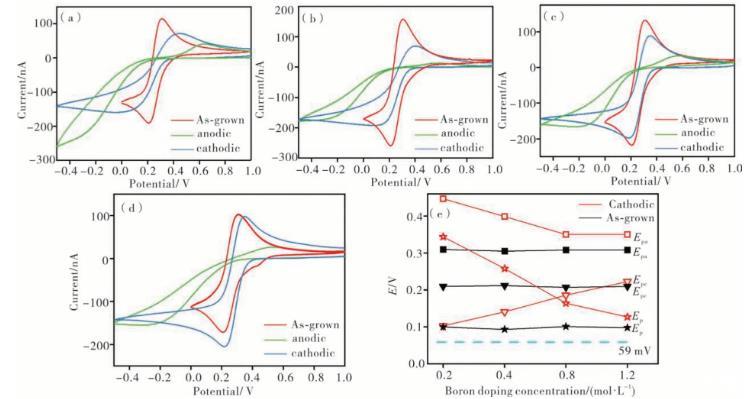 圖5在700℃、掃描速率100 mV·s-1下不同摻硼濃度的BDD微電極在KCl+K3[Fe(CN)6]溶液中的CV及Epa、Epc和ΔEp曲線圖