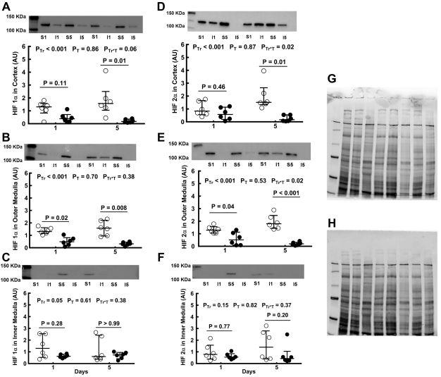 圖5、雙側腎缺血或假缺血后缺氧誘導因子(HIF)蛋白的表達。假缺血(○)或雙側腎缺血(實心○)恢復后24小時和5天,大鼠左腎皮質、外髓質和內髓質組織提取物的HIF-1α(A-C)和HIF-2α(D-F)免疫印跡;每組n=6。G:電泳后凝膠的典型圖像。H:硝酸纖維素膜轉移后的典型圖像。