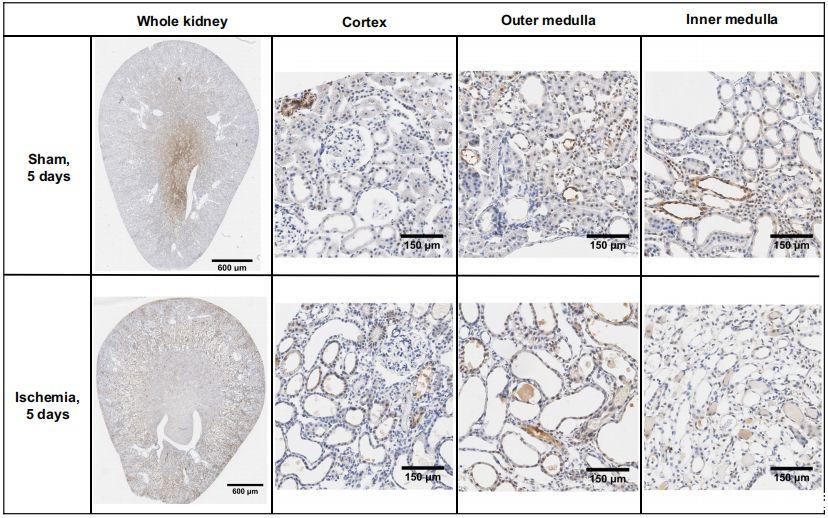 圖3、雙側腎缺血或假缺血恢復24小時后腎臟切片的咪唑加合物免疫組化。圖片為每組六個腎臟皮質、外髓質和內髓質區域的典型圖像。