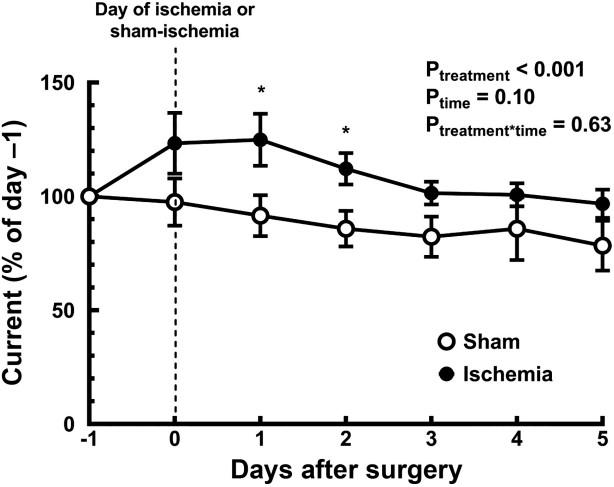 圖1、腎缺血或假缺血后內髓組織PO2的時間變化。數值為大鼠接受一小時假缺血(5只)或雙側腎缺血(7只)后的平均值SE。手術前(第1天)和手術后(第0-5天)記錄組織PO2,以通過碳糊電極的電流進行評估。電流為每個24小時的平均值,并以手術前一天(第1天)平均值的百分比表示。Ptreatment、Ptime和Ptreatment*time是以治療和時間為因子的雙向重復測量方差分析的結果。
