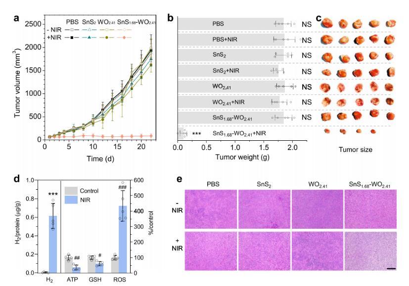 圖5、SnS1.68–WO2.41納米催化劑的體內空穴/氫氣聯合治療表現。(a)4T1腫瘤體積的監測;(b)經22天治療后提取的4T1腫瘤的重量;(c)4T1腫瘤的大小(n=5個生物學獨立樣本);(d)對納米催化劑處理的小鼠,在NIR照射(20分鐘,0.5 W/cm2)前后的腫瘤內H?、ATP、GSH和ROS水平(n=5個生物學獨立樣本);(e)HE染色的腫瘤組織切片。