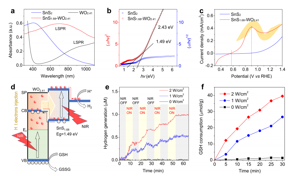 圖3、SnS?.??–WO?.??納米催化劑的光電特性及NIR光催化氫氣生成和GSH消耗性能。(a)UV–VIS–NIR吸收光譜;(b)SnS?和SnS?.??–WO?.??的(αhν)1/2和(αhν)2隨能量(hv)變化的帶隙曲線;(c)SnS?和SnS?.??–WO?.??在808 nm激光照射下的光電流密度–電壓(vs.RHE)曲線;(d)NIR光催化氫氣生成和GSH消耗的機制示意圖;(e)SnS?.??–WO?.??納米催化劑在GSH(10μM)水溶液中808 nm激光照射下,不同功率密度條件下的NIR光催化氫氣生成行為;(f)808 nm激光照射下,不同功率密度條件下的SnS?.??–WO?.??納米催化劑的NIR光催化GSH消耗行為。(a,e,f)圖中的實驗均獨立重復三次,結果相似。