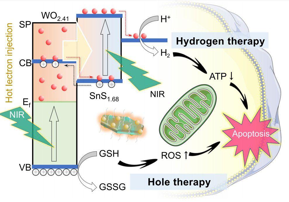 圖1、NIR激活的Z型SnS1.68–WO2.41納米催化劑的空穴/氫氣聯合治療策略和機制的示意圖。