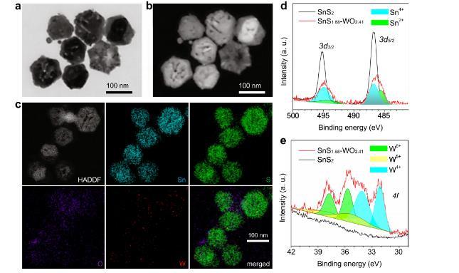 圖2、SnS1.68–WO2.41納米催化劑的形貌、組成和尺寸表征。(a)SEM圖像;(b)對應的STEM圖像;(c)HADDF圖像及元素分布圖;(d,e)SnS?.??–WO?.??納米催化劑的XPS圖譜。這些實驗均獨立重復三次,結果相似。